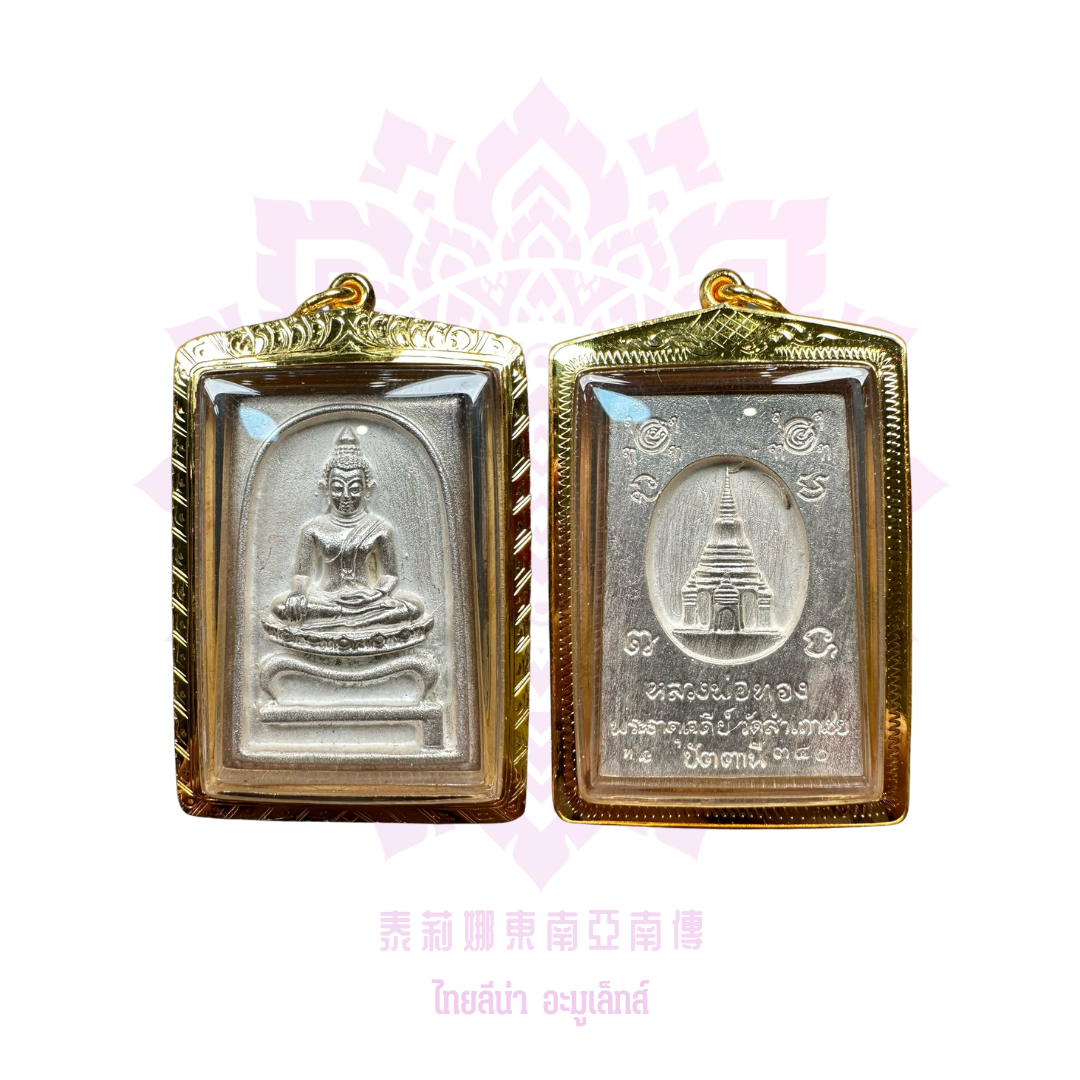 佛牌背面的正中為Wat Samphao Chae 舍利佛塔的圖案,佛塔左右上方各鐫刻一枚高棉經符,周圍環繞四字符咒“Na-Ma-Pa-Ta”,分別象徵宇宙中水、土、火、風四大元素。佛塔下方鐫刻泰文“龍婆通,北大年府Wat Samphao Chae 舍利佛塔,49年”字樣。眾所周知,在如今的收藏界,由阿贊通親自加持的佛牌護符大多價位高漲。例如阿贊通的第一期龍婆督哈佛牌如今的藏價已逾數萬銖。而本期督哈崇迪金屬佛牌採用阿贊通收藏的大量珍貴查暖及聖材鑄造而成。加之阿贊通曾多次為佛牌虔心加持,彼時他身體康健,精力旺盛,故而賦予佛牌極強的法力。尤為難得的是,相較於價格已令藏家們追趕莫及的其他期龍婆督哈佛牌而言,本期督哈崇迪佛牌的藏價尚屬親民,猶如滄海遺珠,令人不禁眼前一亮。