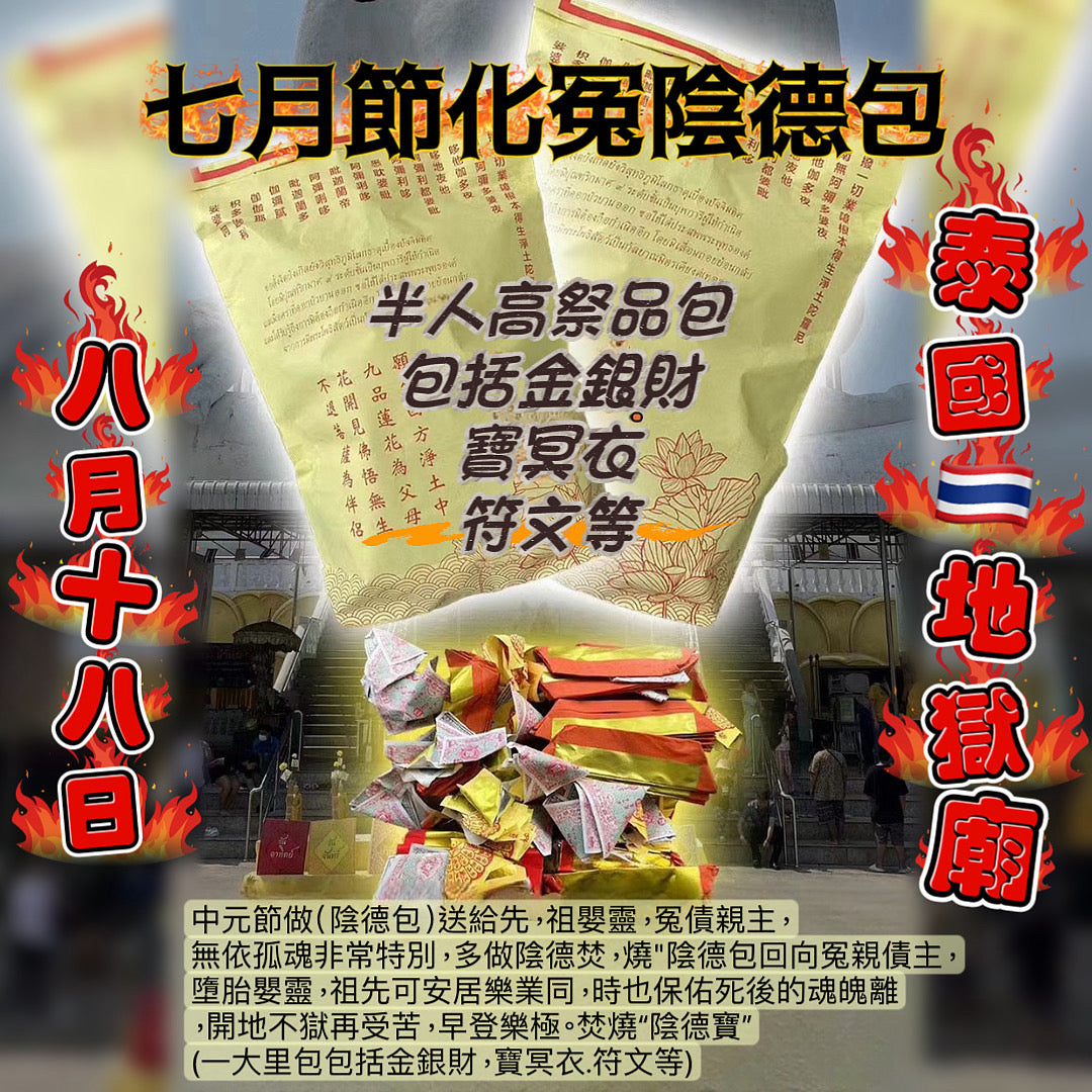 中元節做(陰德包)送給先,祖嬰靈,冤債親主,無依孤魂非常特別,多做陰德焚,燒“陰德包回向冤親債主,墮胎嬰靈,祖先可安居樂業同,時也保佑死後的魂魄離,開地不獄再受苦,早登樂極。焚燒“陰德寶”(一大里包包括金銀財,寶冥衣.符文等)