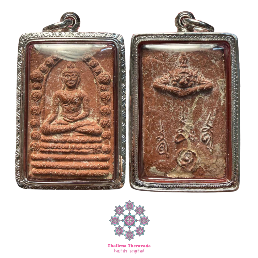 【紅肉美品】阿贊坤潘2530年帕普塔洗雲佛(四興佛)。Phra Buddha Sihing Jatukam Ramathep【洗雲佛】是音譯過來,實際它的意思“四興佛”寓意四方興旺。這期佛牌的法會是值此三佛齊市十二生肖開眼儀式之際。 (洛坤府)2530(1987)年3月5日,對應農歷四月七日,星期四召開大型儀式。由阿贊坤潘組織法會加持。這尊牌正中央為四興佛法相本尊,四興佛本是洛坤府的主佛之一,它以金剛禪坐姿結跏趺坐於仰臥的蓮花座上。由3層基座支撐,上面覆蓋著斜袈裟和短尖尖的僧袍。後為拉胡圍繞著太陽和月亮。底部標有3個印即 Yantra Hua Jai Thon。就是“佛祖心印以及引導元素咒語的心咒。”
