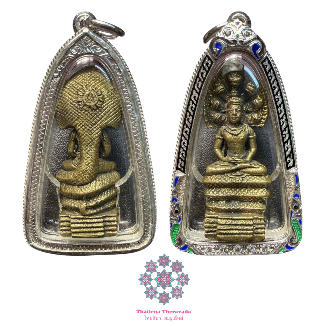 阿贊坤潘,一期澤度金立尊,2532年,黃銅版本。在澤度金歷史上,能夠成為坐標性代表牌的並不多,2530年的粉牌澤度金(僅限粉牌),2532年澤度金立尊,一期帕盼間,2549年的坤潘最後一期和哥錫鐵這幾期應該當之無愧。當然,其他也有標誌性的版本,不過市場價值而言,這幾期屬於較高的等級。澤度金立尊在其中比較特別,這不是傳統的九龍法相,並且很重要的是…這期澤度金在強力助事業的同時,並沒有拉胡法相(所以…你懂的…),而背面不是舍利塔,而是象徵權力的七龍圖騰。熟悉瓦素泰法脈的師兄都知道,老僧王山卡拉培就出過龍神符文,並和藥師一起加持。這期澤度金在泰國的神跡主要在招財轉運提升事業方面,是極少見到的澤度金高端版本。