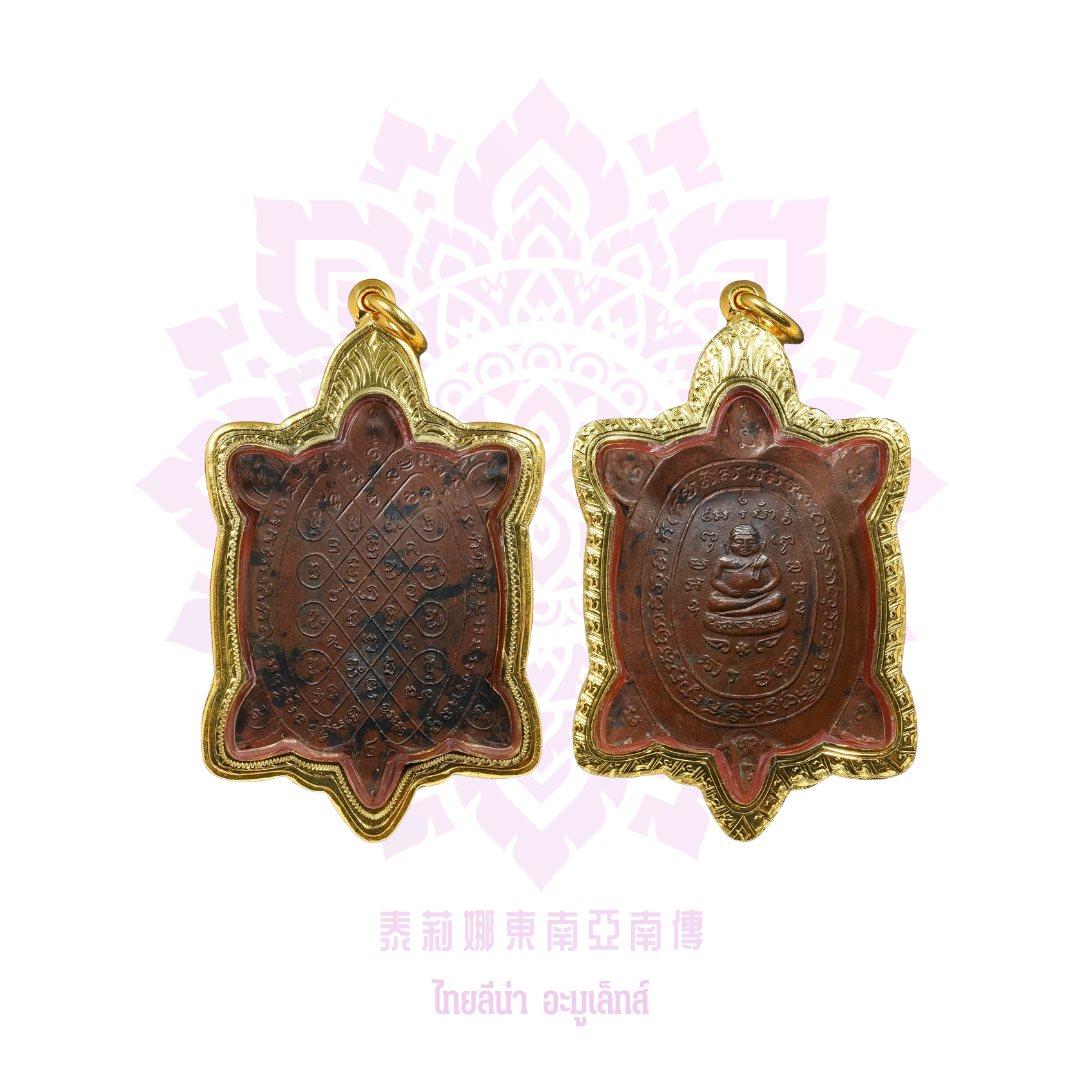 材料上主要以黃銅製作,混合多種經文符片及礦石、寶石、老銅器碎料熔煉成形,以佛歷2567年來計算,距今已有51年的歷史了。設計上,整體烏龜式樣,頭尾四肢皆有經文,中心為善加財像,環繞大量經文,外圍有一圈同樣為經文裝飾的區域,再外面的一圈兩邊有文字裝飾;背面是龍婆柳經典使用的符文組合,包含了各種元素屬性的經文及可以帶來利益的經文符號,用不間斷的線反復交叉環繞,也寓意著好運不斷,同時有壁壘特性,兼具守護的力量。本尊由於長年的實際佩戴,對於銅質有所磨損,不過這對於實際法力來說沒有影響。功德利益方面,佩戴財龜可以招各方人緣財運、助行事順利、生意興隆、抵擋108種險難(兵變、戰亂、各類自然傷害(雷擊、洪水、地震)、動物襲擊、小人搗亂等)、還債清債、保出行平安,屬於近代著名招財聖物,守護方面雖然不能算是擋險類型最強的佛牌種類,但是就廣泛的抵擋範圍來說也是佩戴者極為重視的。財龜的特性適合所有成年人群,小孩子佩戴一樣可以保護自身安全。